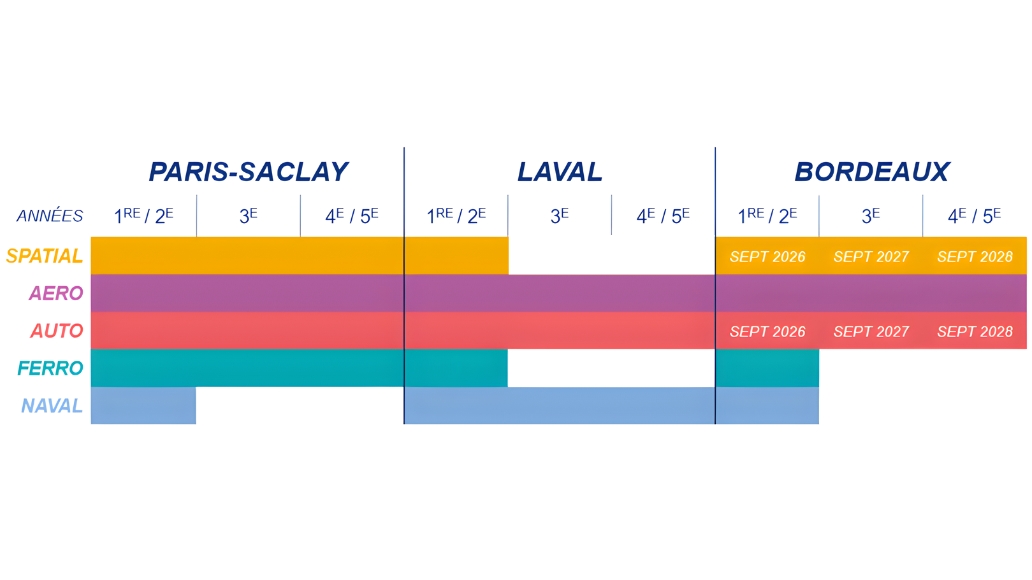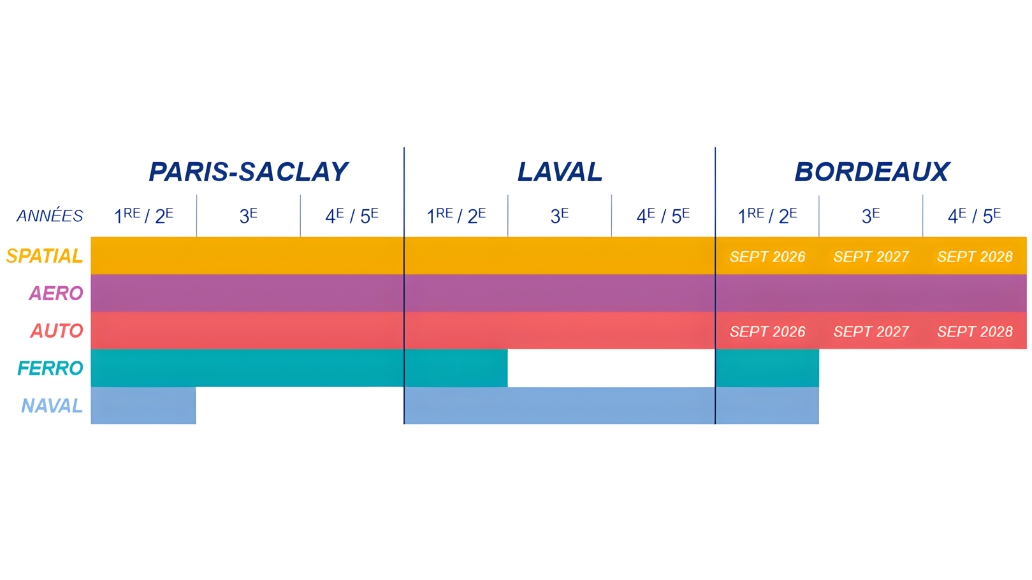- À ESTACA Bordeaux, les étudiants en 1re année peuvent choisir les filières Automobile, Aéronautique ou Spatiale. En admissions parallèles, la 3e et la 4e années Automobile et Spatial ouvrent respectivement pour les rentrées 2027 et 2028.